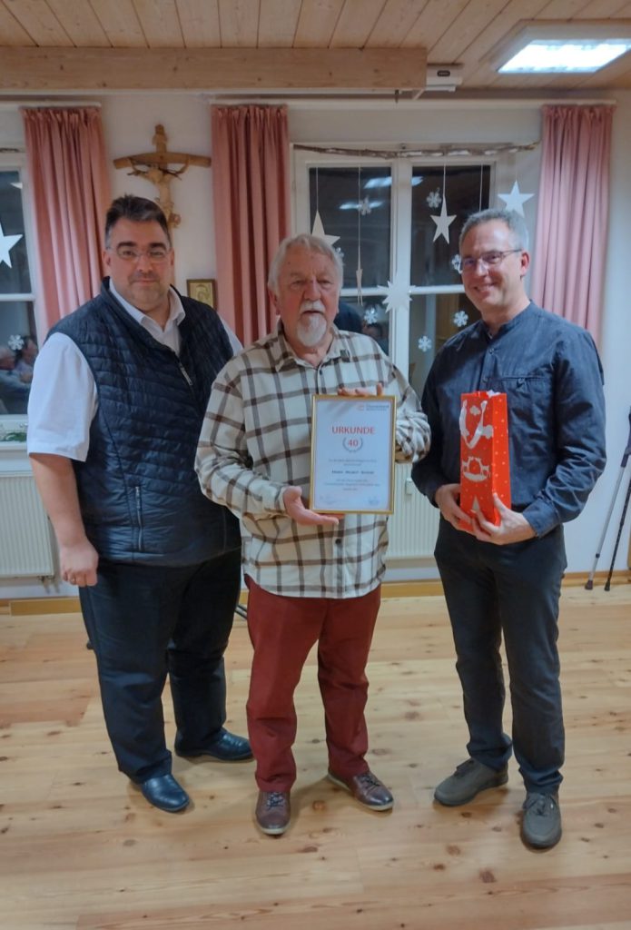 Am Ende zeichneten der Vorsitzende Christian Zoller, Chorleiter Richard Hoffmann und der Zweite Vorsitzende Herbert Siegel vom Sängerkreis Unterallgäu Richard Schweiger für 40 Jahre, Johann Irsigler für 50 Jahre und Anton Mayer für 65 Jahre Chorgesang mit einer Ehrenurkunde und der Ehrennadel aus. In seiner Laudatio ging Richard Hoffmann auf die drei Persönlichkeiten ein, die alle ihre Leidenschaft und Hingabe zum Chorgesang seit Jahrzehnten zum Ausdruck bringen und dafür langanhaltenden Applaus ernteten. Am Ende des zweistündigen Konzerts machten die Sängerinnen und Sänger dann Platz für die Partyband „Firedance“, die das Publikum bis weit nach Mitternacht zum Tanzen aufforderte und bei gutem Wein und herzhaften Schmankerln für einen rundum gelungenen Abend sorgten.